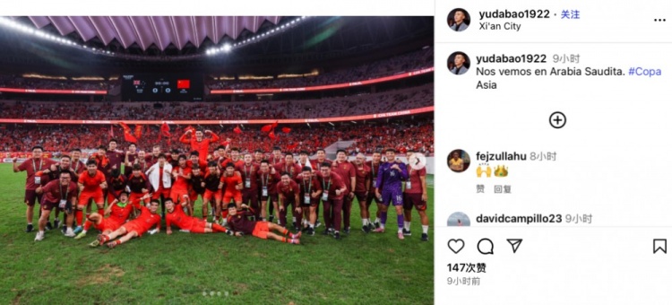 赛后前国脚、现担任U22国足教练组成员的于大宝更新社媒,晒出了赛后全队庆祝的合照,并用葡语写道:“让我们沙特再见。”